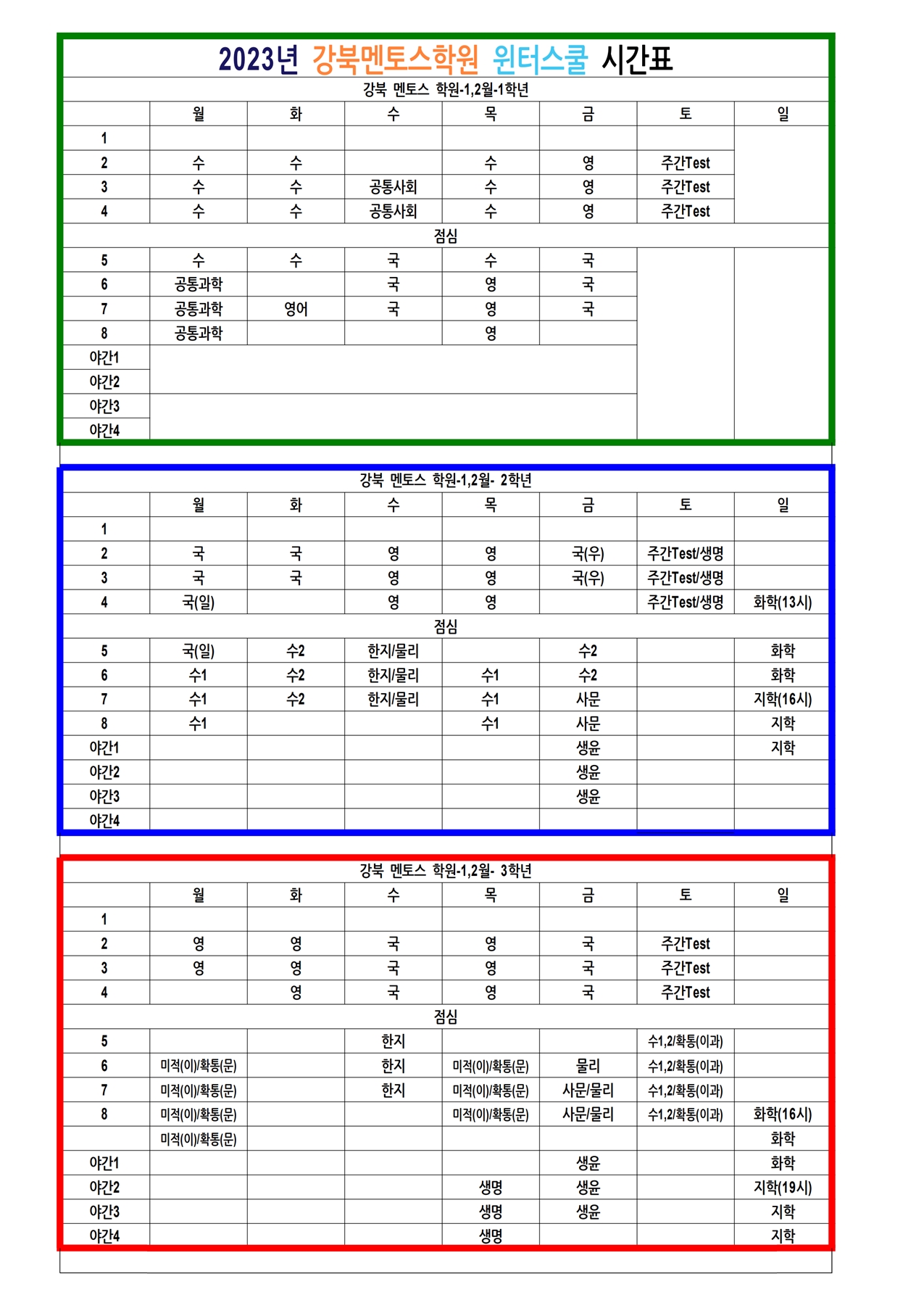 2023년 강북멘토스 윈터스쿨 시간표 안내